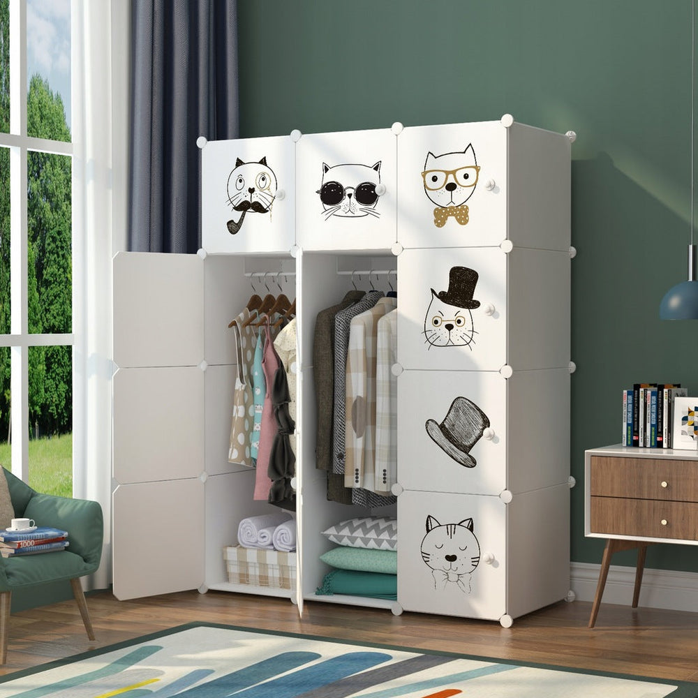 Acest dulap nu este doar practic, ci și extrem de atrăgător datorită designului jucăuș al ușilor, decorate cu pisicuțe simpatice – unele purtând ochelari, altele cu pălării cochete, aducând un aer ludic și prietenos în orice încăpere. Este alegerea perfectă pentru pasionații de pisici sau pentru a adăuga un plus de personalitate camerei unui copil.
