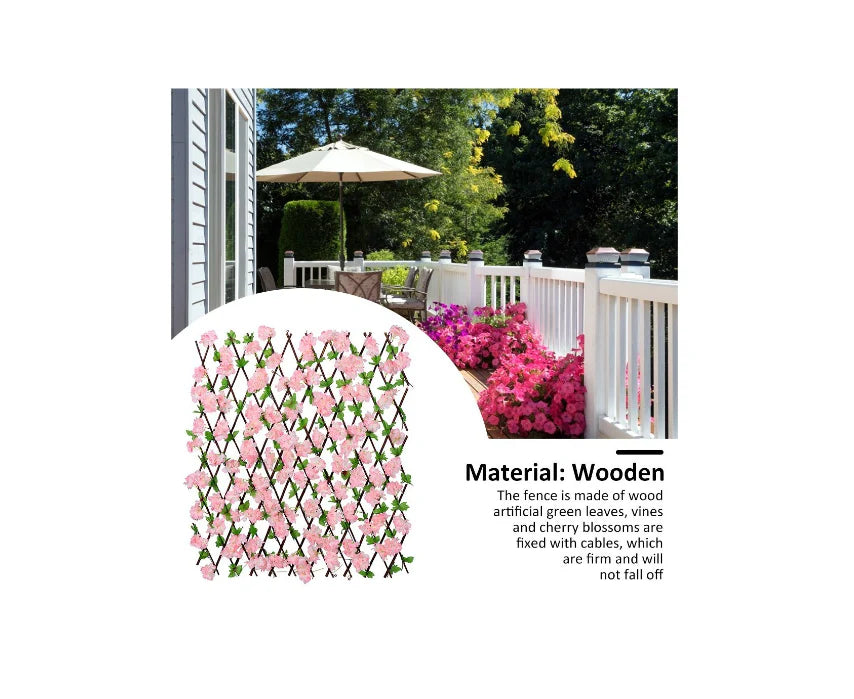 Acest panou decorativ de gard artificial, cu frunze verzi si flori roz de cires, este perfect pentru cei care doresc sa imbunatateasca estetica si intimitatea spatiilor lor fara a se preocupa de intretinerea unui gard viu natural. Ideal pentru diverse utilizari, de la decorarea gradinilor si balcoanelor pana la crearea unui decor atractiv pentru evenimente sau showroom-uri, acest gard artificial aduce un plus de frumusete si functionalitate in orice spatiu.