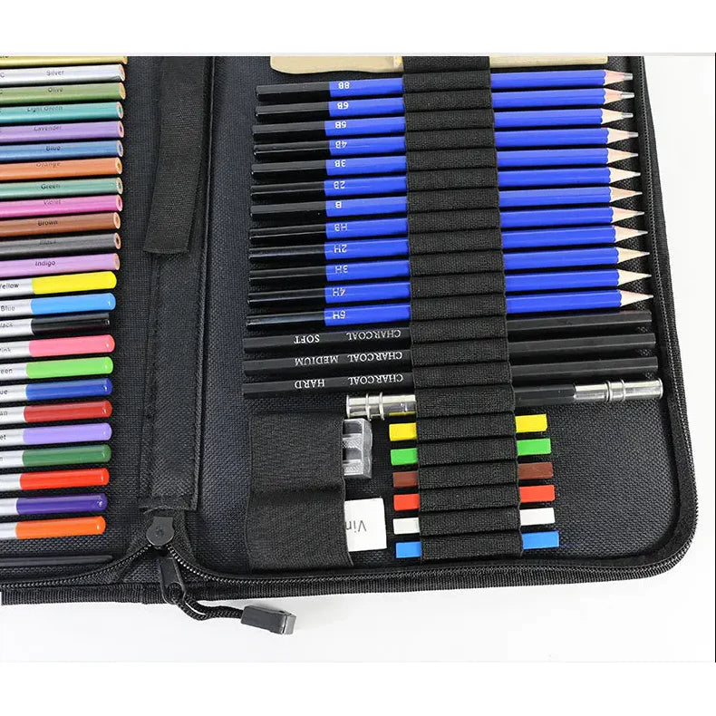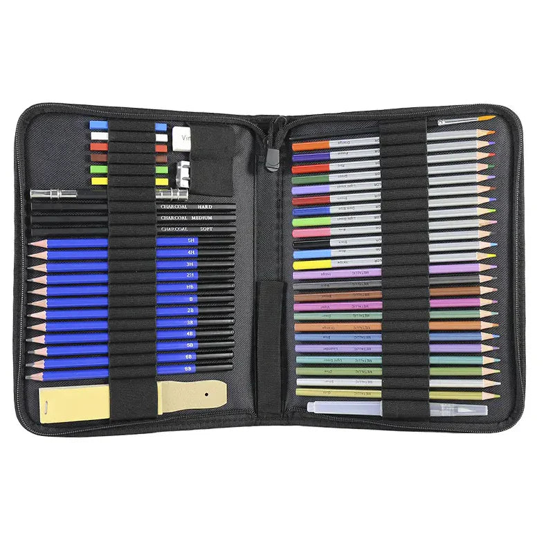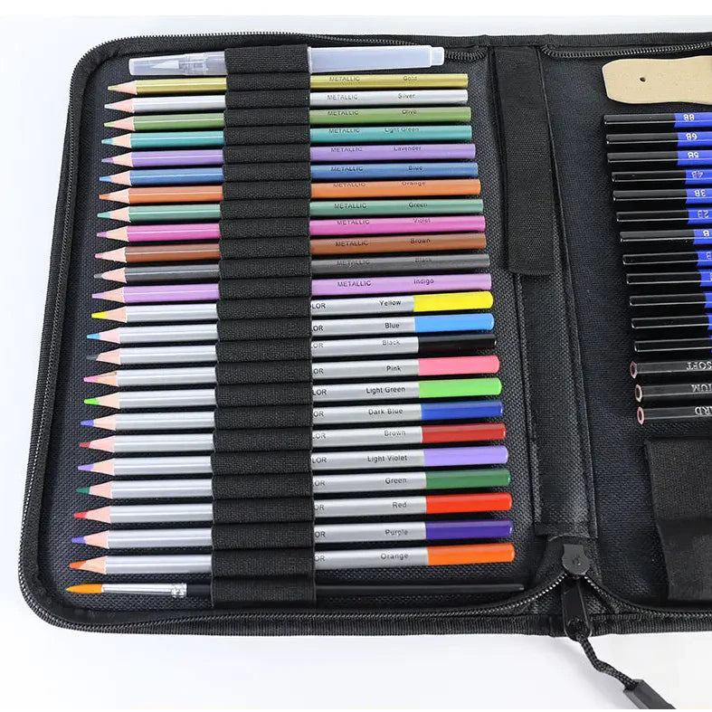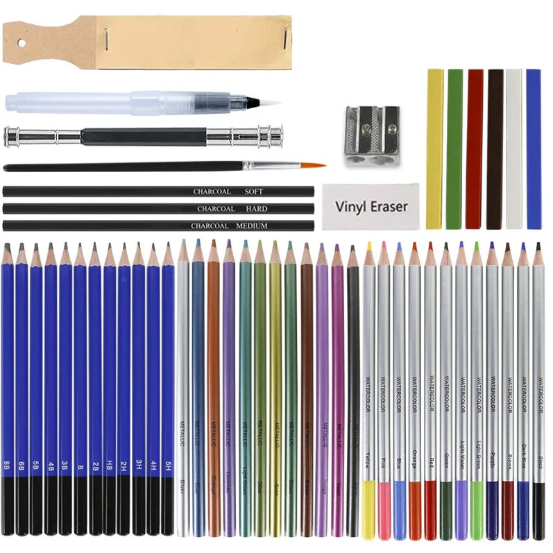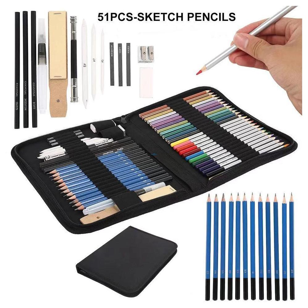 Setul de creioane de schita este prevazut cu 51 de accesorii de arta, care contine 1 ascutitor de creioane, 12 creioane pentru schita, 12 creioane colorate metalice, 12 creioane colorate solubile in apa, 3 creioane cu carbune, 1 prelungitor pentru creion. 1 radiera si atat de multe alte accesorii, te poti intalni cu ceea ce iti doresti in crearea schitelor.