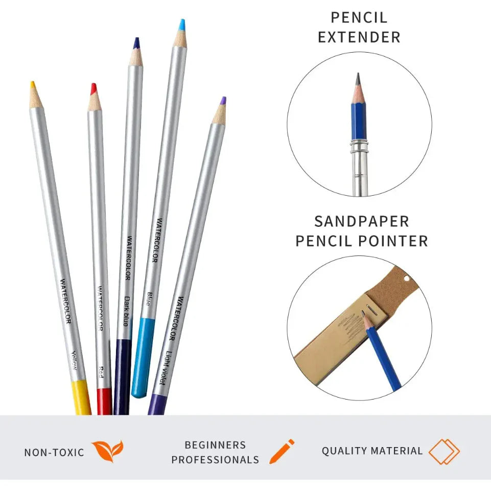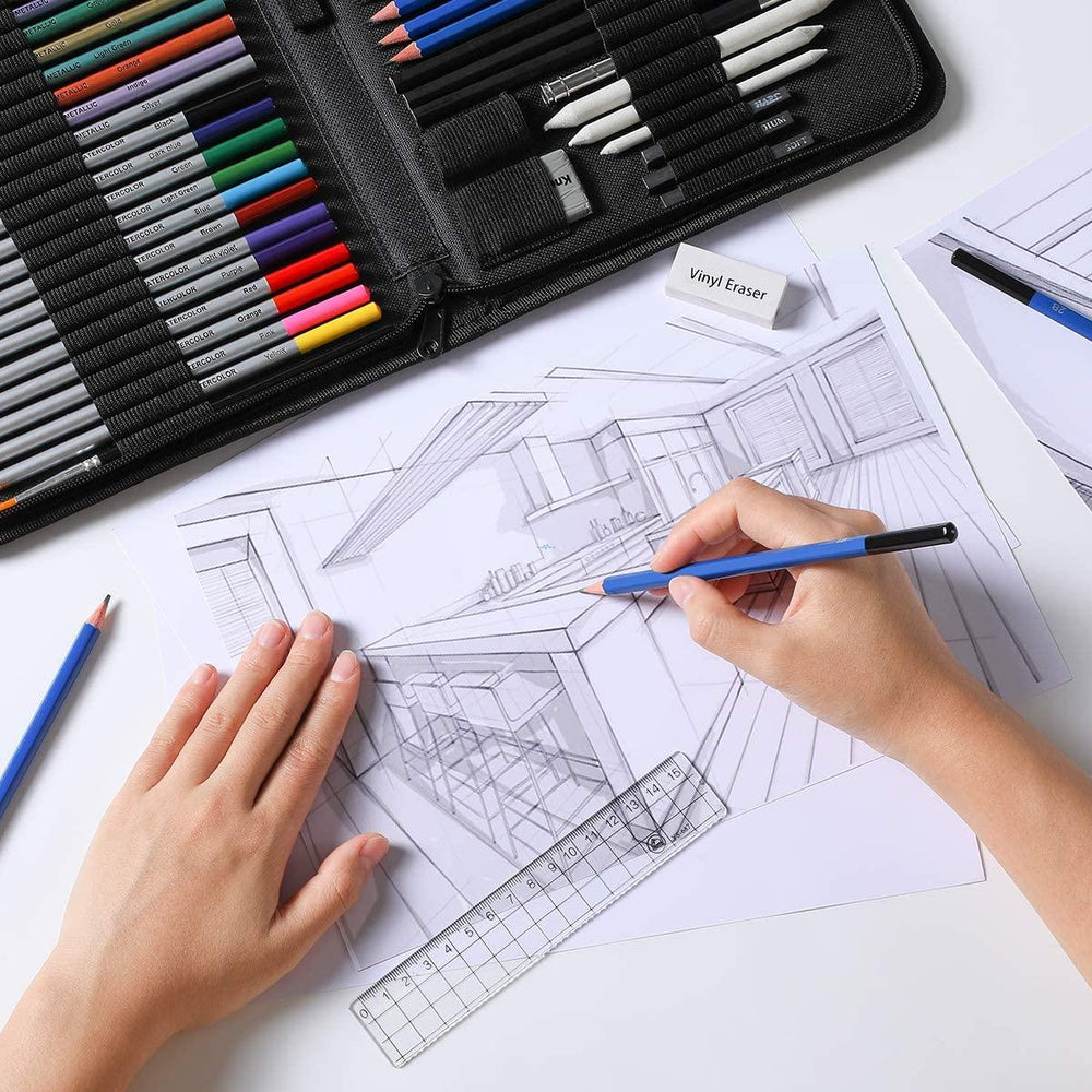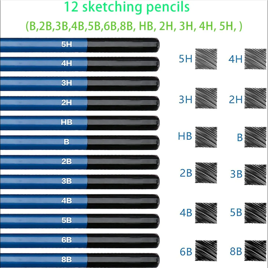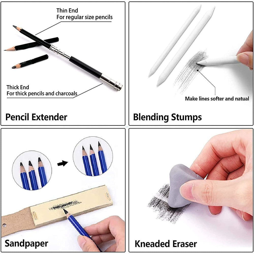 Setul de creioane de schita este prevazut cu 51 de accesorii de arta, care contine 1 ascutitor de creioane, 12 creioane pentru schita, 12 creioane colorate metalice, 12 creioane colorate solubile in apa, 3 creioane cu carbune, 1 prelungitor pentru creion. 1 radiera si atat de multe alte accesorii, te poti intalni cu ceea ce iti doresti in crearea schitelor.